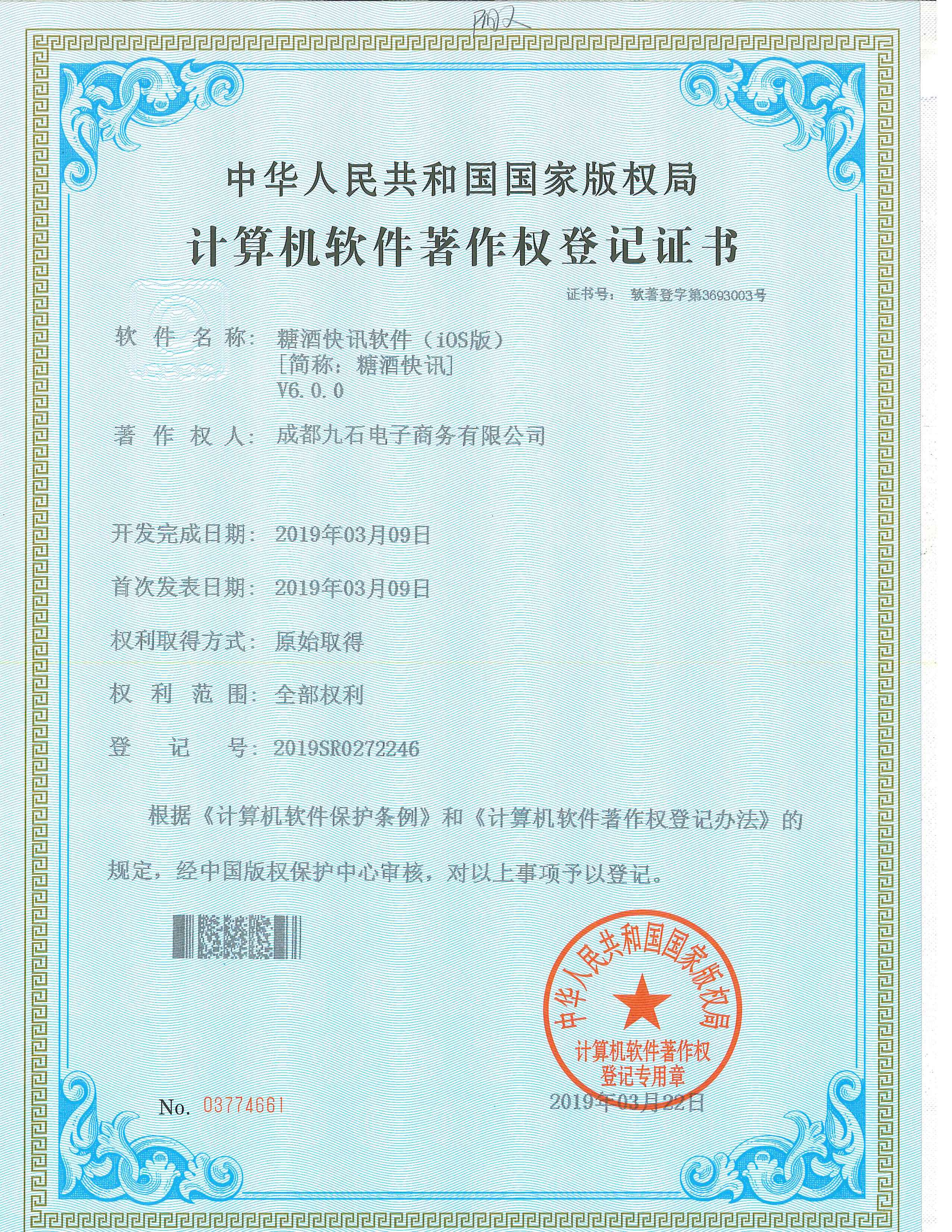 根据成都九石电子商务有限公司出具的《计算机软件著作权登记证书》,成都九石电子商务有限公司是糖酒快讯APP的创建者、持有者(详见附件)。