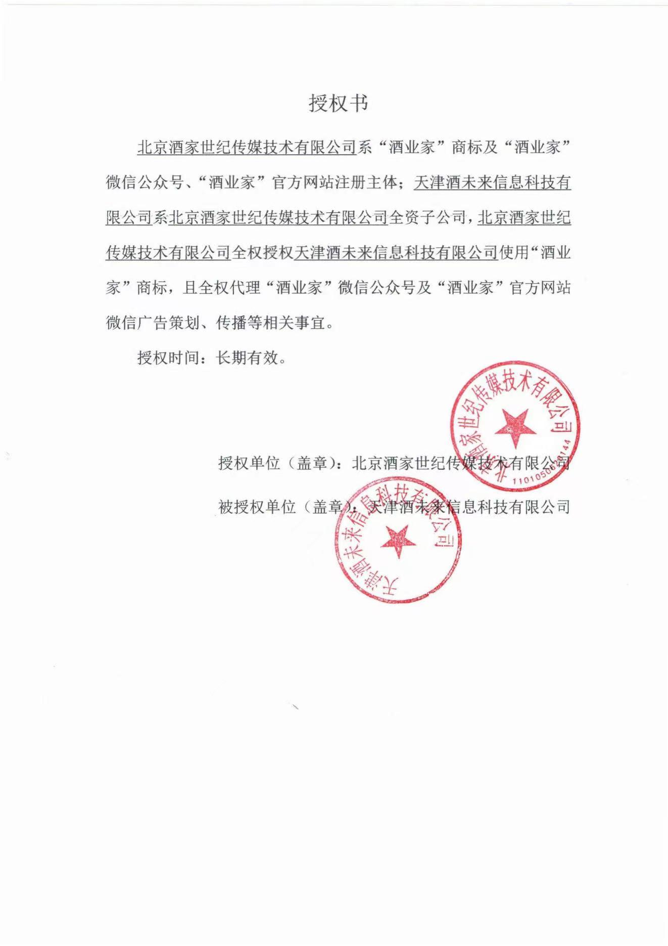 根据北京酒家世纪传媒技术有限公司、天津酒未来信息科技有限公司联合出具的授权书,北京酒家世纪传媒技术有限公司全权授权天津酒未来信息科技有限公司使用“酒业家”商标,且全权代理“酒业家”微信公众号及“酒业家”官方网站等平台的广告策划、传播等相关业务(详见附件)。