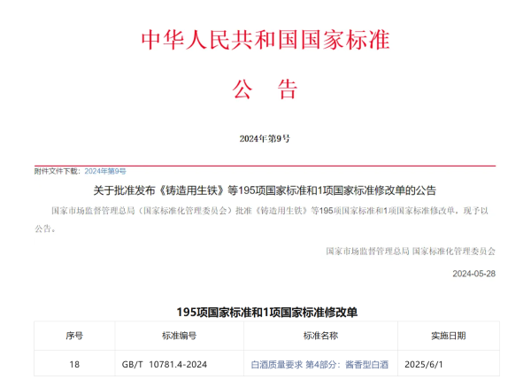 日前,国家市场监督管理总局(国家标准化管理委员会)发布《关于批准发布〈铸造用生铁〉等195项国家标准和1项国家标准修改单的公告》。其中GB/T 10781.4-2024《白酒质量要求 第4部分:酱香型白酒》上榜,将于2025年6月1日正式实施。该标准在贵州省市场监督管理局指导下由茅台牵头,并会同中食院有限公司、贵州省产品质量检验检测院、兄弟酒企等单位修订。