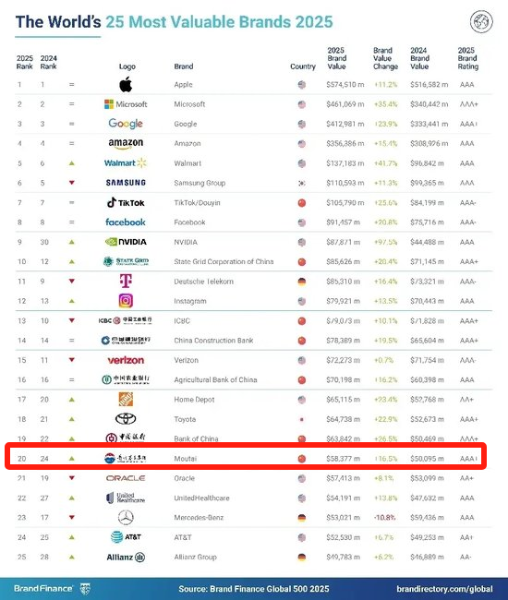 瑞士时间1月21日,《Brand Finance 2025年全球品牌价值500强榜单报告》在瑞士达沃斯正式发布。报告显示,茅台集团的品牌价值较2024年上升17%,达到584亿美元,位列全球第20位,比2024年上升4名,品牌强度为AAA+。