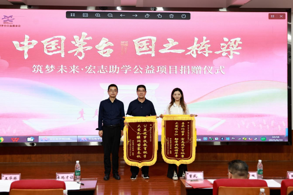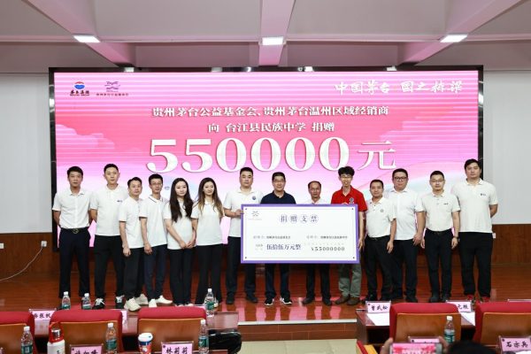 捐赠仪式上,贵州茅台公益基金会携手贵州茅台温州经销商代表,联合向台江县民族中学宏志助学公益项目捐赠善款55万元,台江县委向经销商代表授予了锦旗。