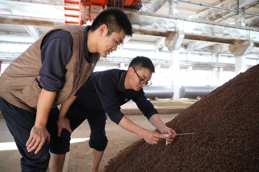 王鸿与徒弟查看堆积发酵情况