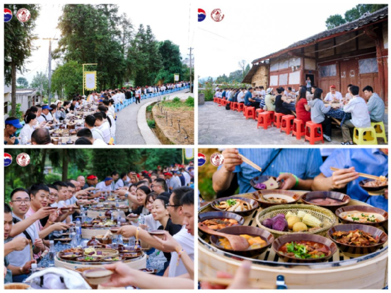 在庆祝丰收的热烈氛围中,“高粱丰筵”热情而来,以一场盛大而温馨的长桌宴款待四方来宾。宴席以“丰收九大碗”的形式,精心呈现了仁怀地域的饮食文化与酒文化特色。嘉宾们围坐一堂,共同分享着来自土地的馈赠和父老乡亲辛勤劳作的成果,共同绘制出一幅和谐的乡村丰收图景。
