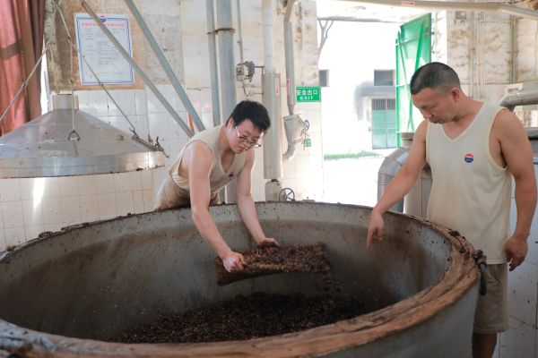 现制酒七车间23班副班长余兴鸿,也是邹良洪的徒弟。当见到余兴鸿时,他正在邹良洪的耐心指导下上甑,“见汽压醅”“轻、松、薄、匀、平、准”……邹良洪讲得仔细,余兴鸿也做得有板有眼。不多会,汗水已然浸湿了余兴鸿的衣衫,可在邹良洪的眼中,这远远没有达到要求,仍需多加练习。
