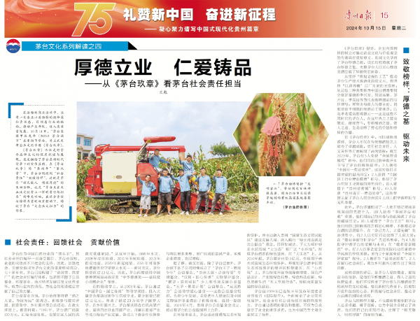 茅台作为中国白酒行业的“领头羊”,其社会责任的履行一直备受瞩目。茅台亦深知,企业的成功离不开社会的支持,因此,回馈社会、贡献价值成为茅台文化的重要组成部分。七十多年来,茅台已经构建了“范围宽、维度广”的社会责任履行体系,包括但不限于公益事业、环保事业、地方经济发展以及文化传承等,成为行业内的典范,为社会的和谐稳定贡献了自己的力量。