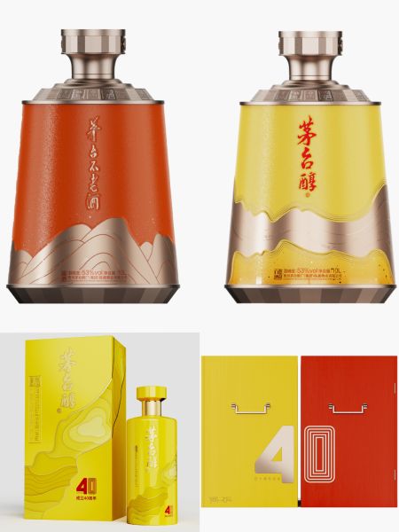 20L保健酒业公司40周年纪念酒中,茅台醇以2024年东方主题色“缃叶色”作为主色调,茅台不老酒以中国传统颜色“朱砂色”结合“中国红”为主色调。器型均为圆形酒坛、上窄下宽,瓶身采用“水利万物而不争”的赤水河作为主视觉,茅台保健酒业公司四十年大事记曲线图也呈现之上。瓶肩部位雕刻篆书的二十四节气,瓶盖、瓶肩、瓶底皆为24个切面,体现酿酒工艺的循天时、接地利、造人和,在道法自然之间相辅相成、融会贯通,达到三才兼具、天人合一的境界。值得一提的是,20L40周年纪念酒的两坛酒包装可以进行组合,侧面显示出“40”字样,顶端则显示为“太极”相合之象,取40载风雨岁月之意、时间年轮之理、步步升华之品。