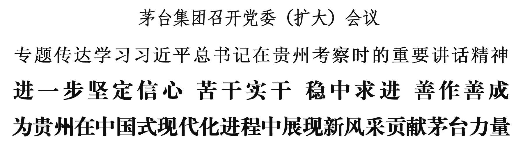 会议强调,习近平总书记在贵州考察时的重要讲话,高屋建瓴、思想深邃,内涵丰富、催人奋进,深刻阐明了事关贵州长远发展的一系列重大理论和实践问题,既是一以贯之的战略指引,也是与时俱进的精准指导,对新征程上贵州发展的全局性、根本性、战略性问题把脉定向,贯穿新发展理念的工作要求、彰显以人民为中心的价值取向、体现勇闯新路的创新精神、凸显从严从实的鲜明导向,极具思想引领力、政治动员力、实践穿透力,是做好贵州以及茅台工作最权威、最深刻、最有力的科学指导。茅台上下要切实把思想和行动统一到习近平总书记重要讲话精神和省委相关要求上来,坚定不移走好高质量发展之路,以全面深化改革为动力,进一步坚定信心、苦干实干,稳中求进、善作善成,努力为贵州在中国式现代化进程中展现新风采贡献更多茅台力量。