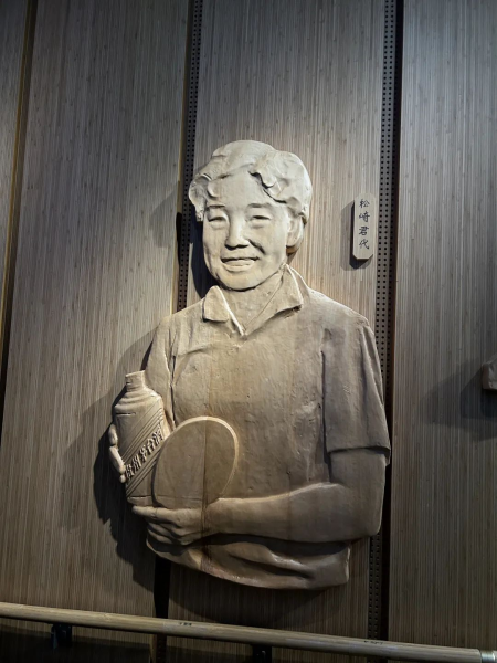手持茅台酒瓶的日本前乒乓球国手松崎君代浮雕