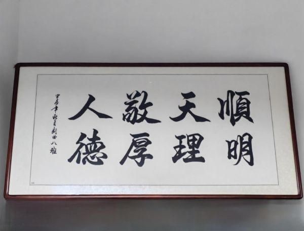 其中,一幅《顺天敬人 明理厚德》的行书格外引人注目。作品装裱在深褐色画框中,“顺天敬人 明理厚德”八个大字笔力雄健,墨色酣畅,在柔和的灯光映照下,仿佛能嗅出墨香与酒香交织的气息。