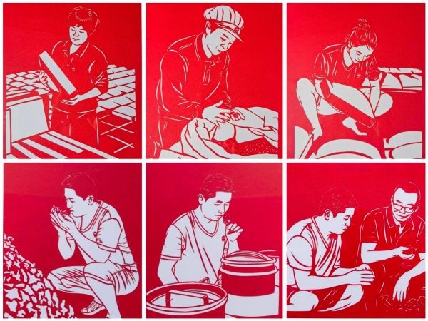 画面中,匠人躬身劳作的身影,整齐排列的曲坯,小麦如点点繁星……刘世琴以精巧细腻的非遗剪纸艺术手法,将茅台的制酒和制曲等场景跃然纸上。于方寸之间,把茅台传统工艺的精髓展现得淋漓尽致。