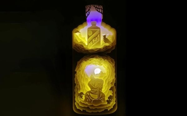 当灯光亮起,作品的层次感瞬间显现。山峰层峦叠嶂,由远及近,带领观者穿越时空,置身于赤水河畔。在光影交错间,从酿造到品鉴,从历史到现代,无不展现出茅台文化的源远流长。