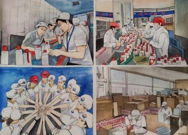 作品由四个精心设计的包装场景构成,每一幅画面都承载着特定的象征和意义,不仅展现了杨莉精湛的绘画技艺,更深刻地传递着包装车间的质量理念和团队精神。