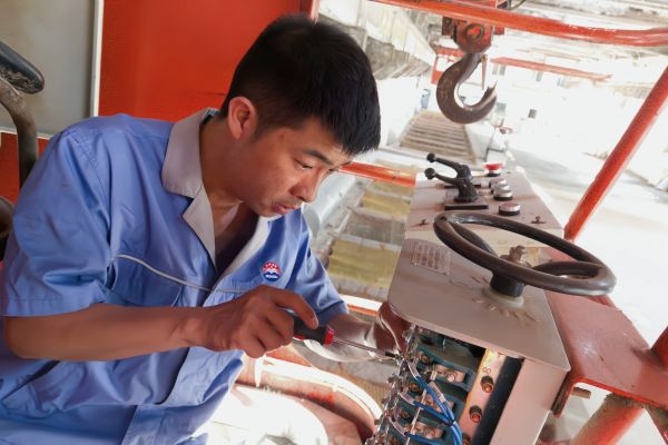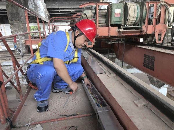 在另一边,二工段维修7班班长余游带领三名队员正对一台故障频发的行车进行检修,在作业现场,他一边拧动扳手铺设新线,一边向同事传授接线技术要点。