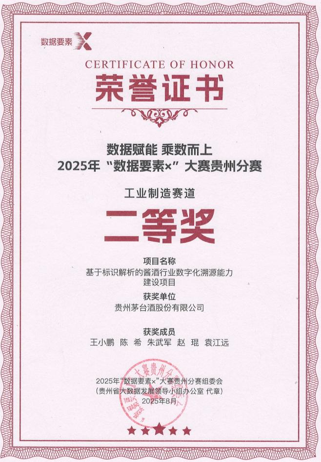 2025年8月,赵琨作为项目参与人之一,申报的《基于标识解析的酱酒行业数字化溯源能力建设项目》,荣获2025年“数据要素×”大赛贵州分赛“工业制造赛道”二等奖。