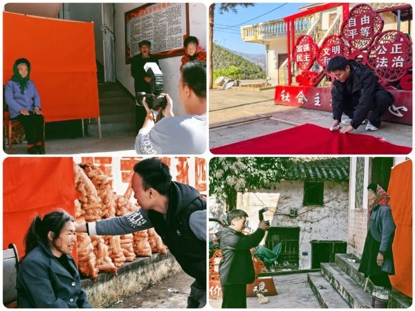 对于腿脚不便的老人,驻村队员们便扛着红布、背着相机,爬坡上坎上门服务。从平房到小楼,从干净的堂屋到堆满玉米的院落,这家拍完便马不停蹄赶往下一户。渐渐地,村民们都熟悉了队员们的身影,都说“咱们村和其他村好像不一样,多了一个流动照相馆”。