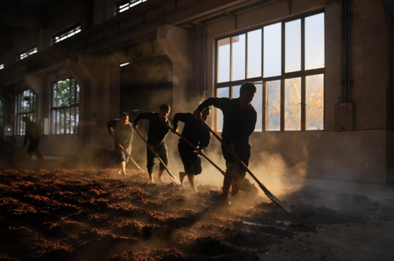 每年农历五月初五,赤水河因紫红泥冲刷泛红,正是高温制曲的最佳时节,受邀的茅台工匠会“茅酒之源”酿酒工业遗址广场,依次完成“敬天、敬地、敬水”“取麦与润麦”“熏仓”三大环节。这一习俗早在“三家烧房”时期便已成型。