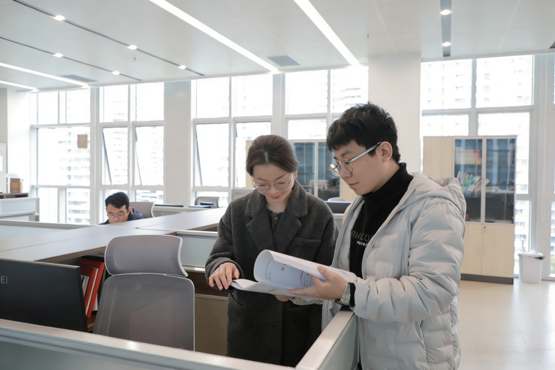 张思宇与同事黄娅兰探讨项目报告